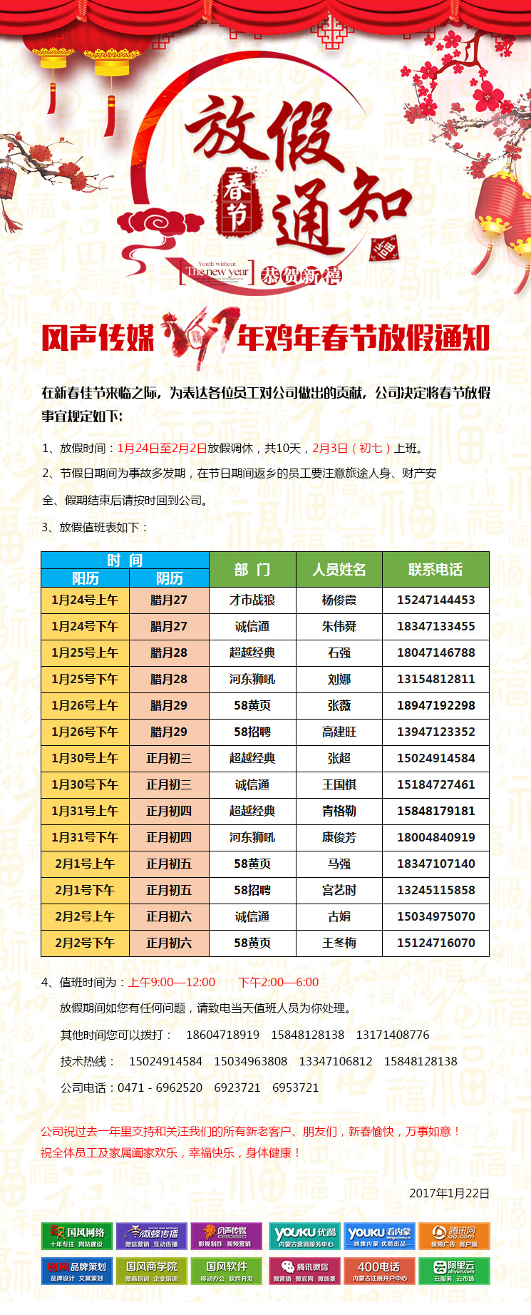 風(fēng)聲傳媒2017年雞年春節(jié)放假通知